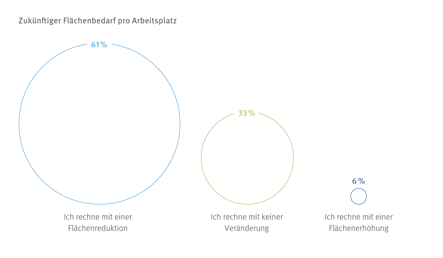 Auch im Drees & Sommer Workspace Benchmark Report 2022 rechnen 61 % der 230 Teilnehmenden aus verschiedenen Unternehmen und rund 20 unterschiedlichen Branchen mit einer Flächenreduktion der Arbeitsfläche.